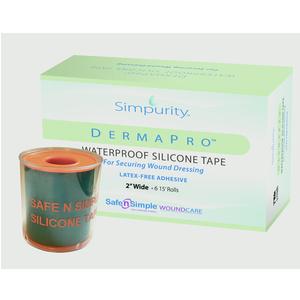 Simpurity DermaPro Waterproof Silicone Tape, 2" x 5 yard. Simpurity DermaPro Waterproof Silicone Tape is latex free and has a silicone adhesive that is gentle to remove from sensitive skin areas. Superior for securing wound dressings and repelling moisture from outside contaminants.